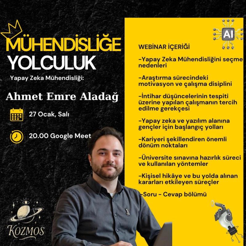 Kozmos Topluluğu'nun Mühendisliğe Yolculuk serisi kapsamında yapay zeka mühendisliği üzerine bir webinar gerçekleştireceğim. Bu webinarda kendi mühendislik yolculuğumu, üniversite sürecimi, yapay zekaya yönelme nedenlerimi ve bu alana ilgi duyan gençlere yönelik deneyimlerimi paylaşacağım.