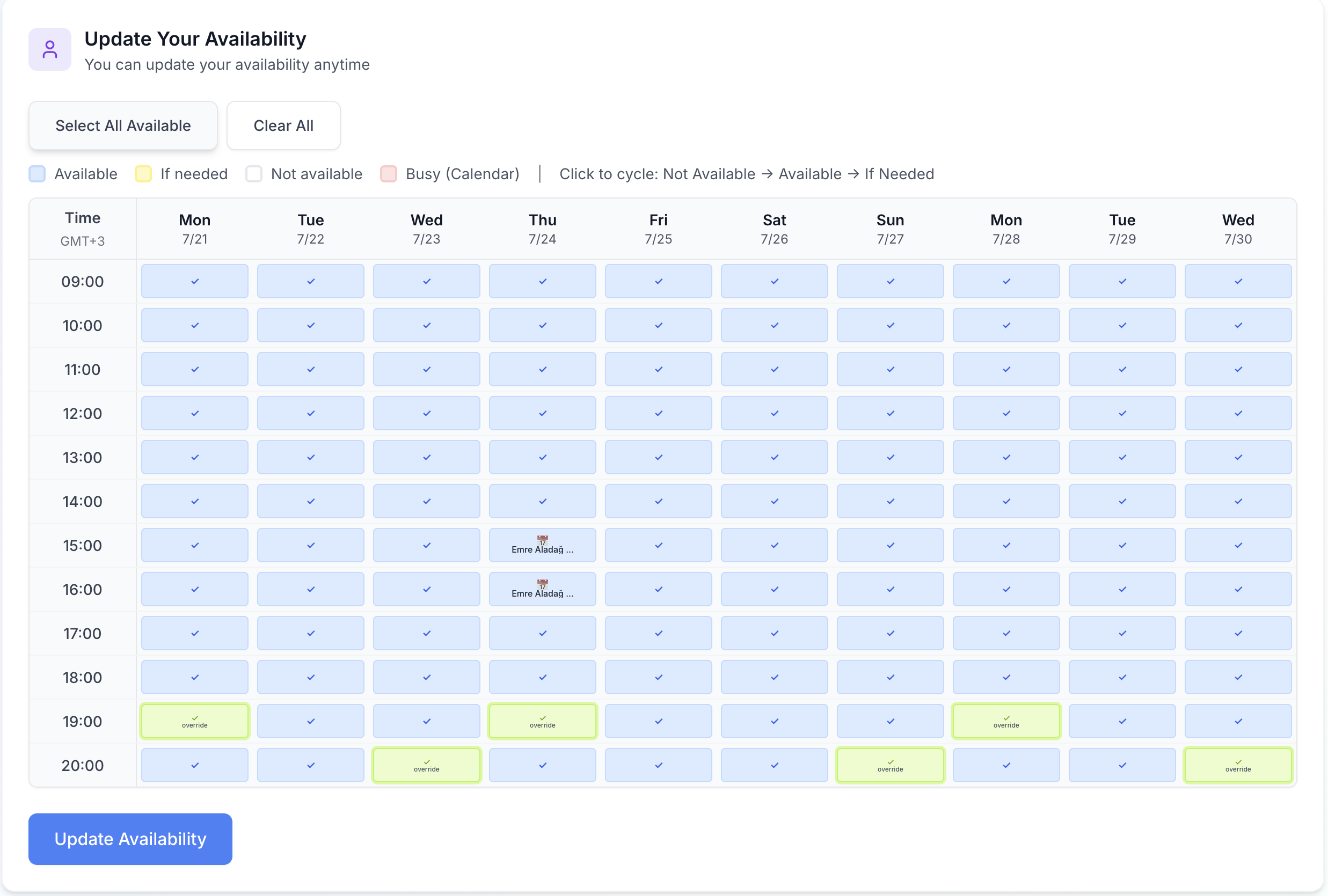 Meeting time finder for multiple people by connecting their calendar, or picking their available slots on calendar view.